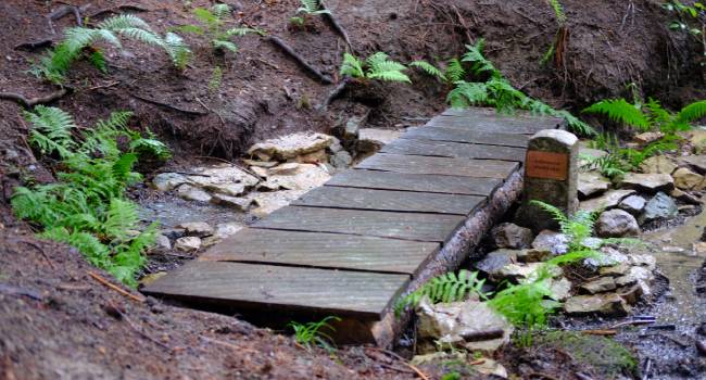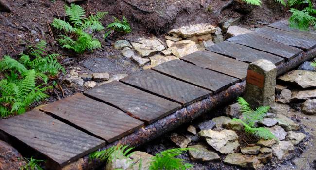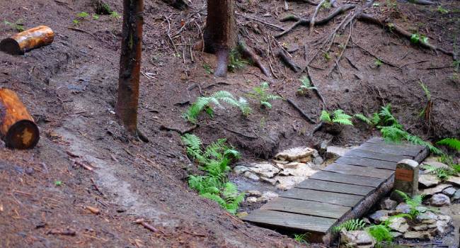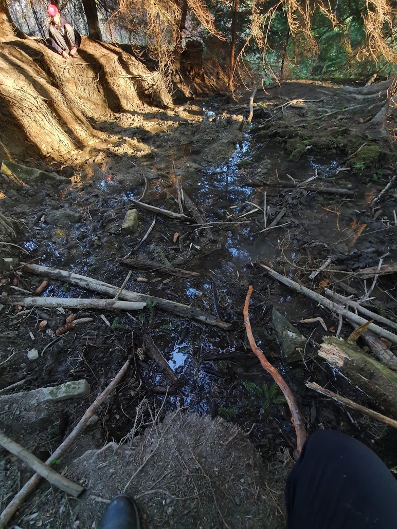Objevuje zarostlé, kládami a roštím zapadané, bahniště.